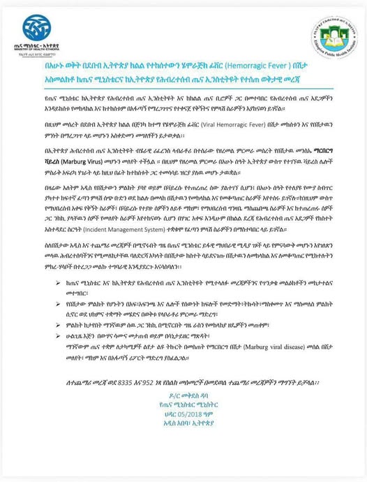 Read moreየአደጋ ጊዜ ፈጣን ምላሽ ሰጪ ቡድኖች የማርበርግ ቫይረስ በሽታ ወደ ተገኘበት አካባቢዎች ተልከው ቫይረሱን የመከላከልና የመቆጣጠር ስራ እየተሰራ ይገኛል