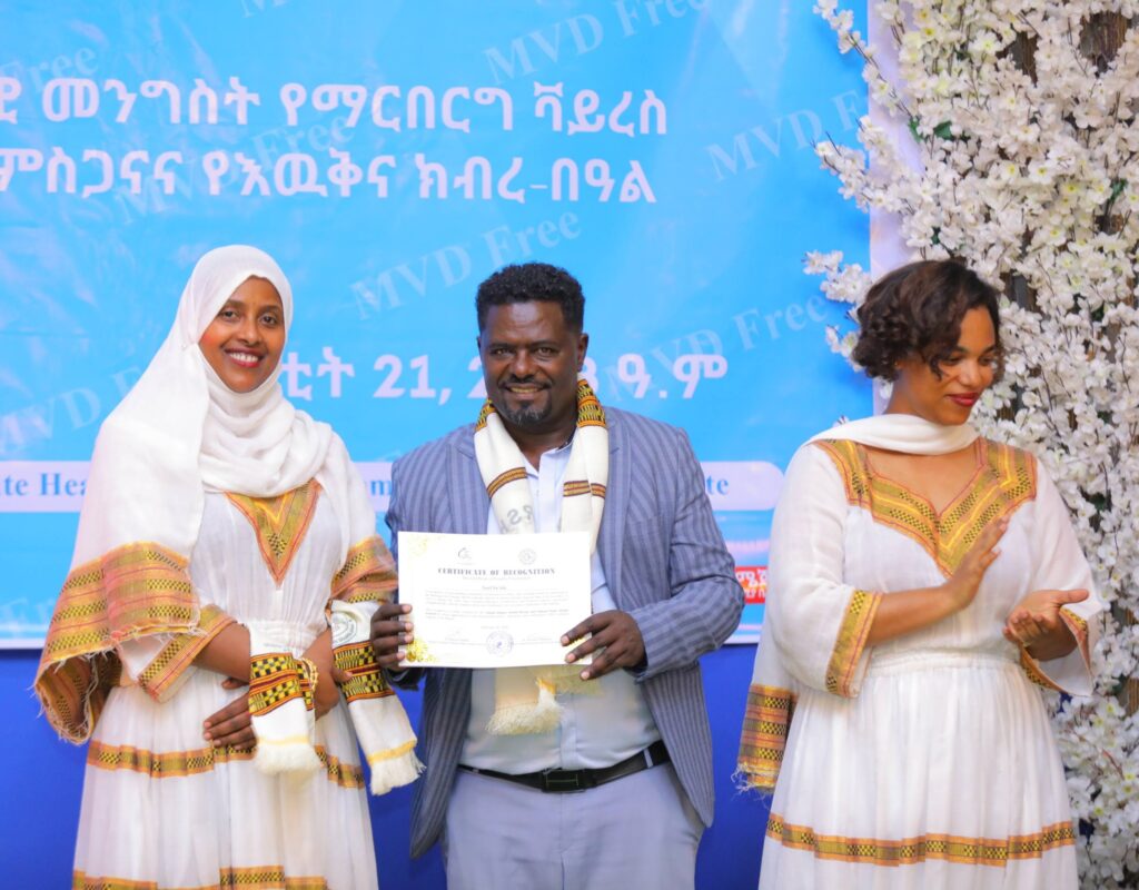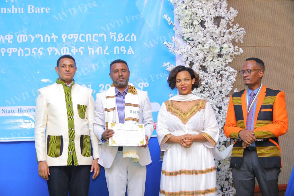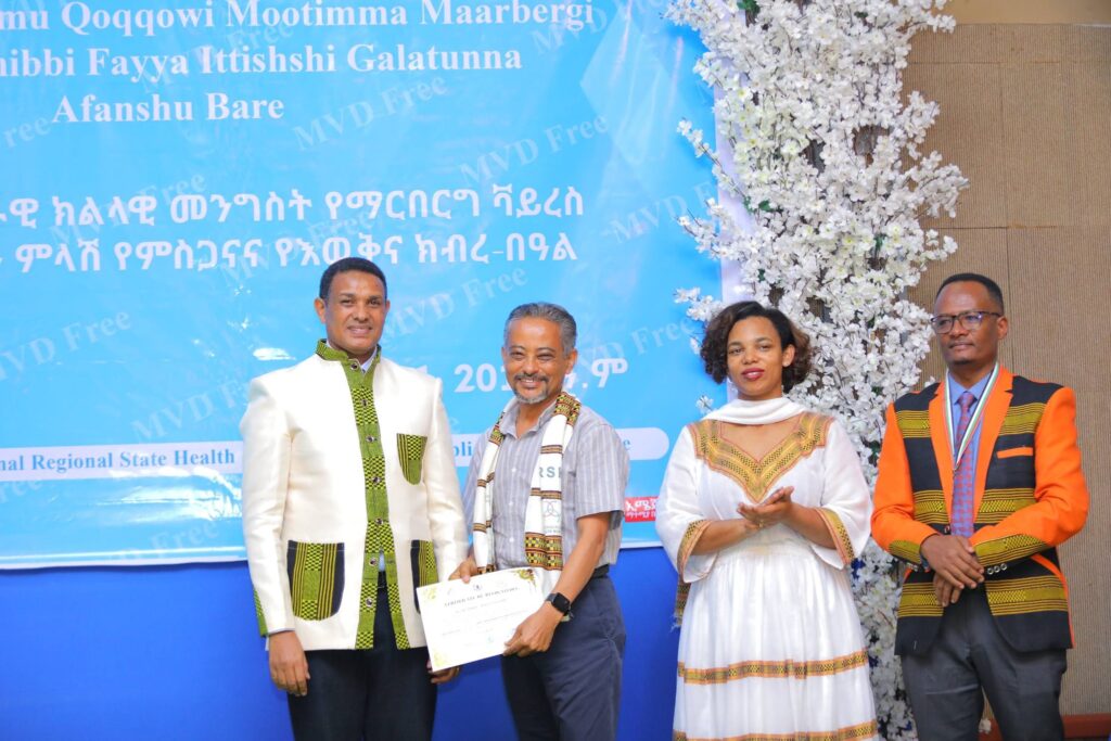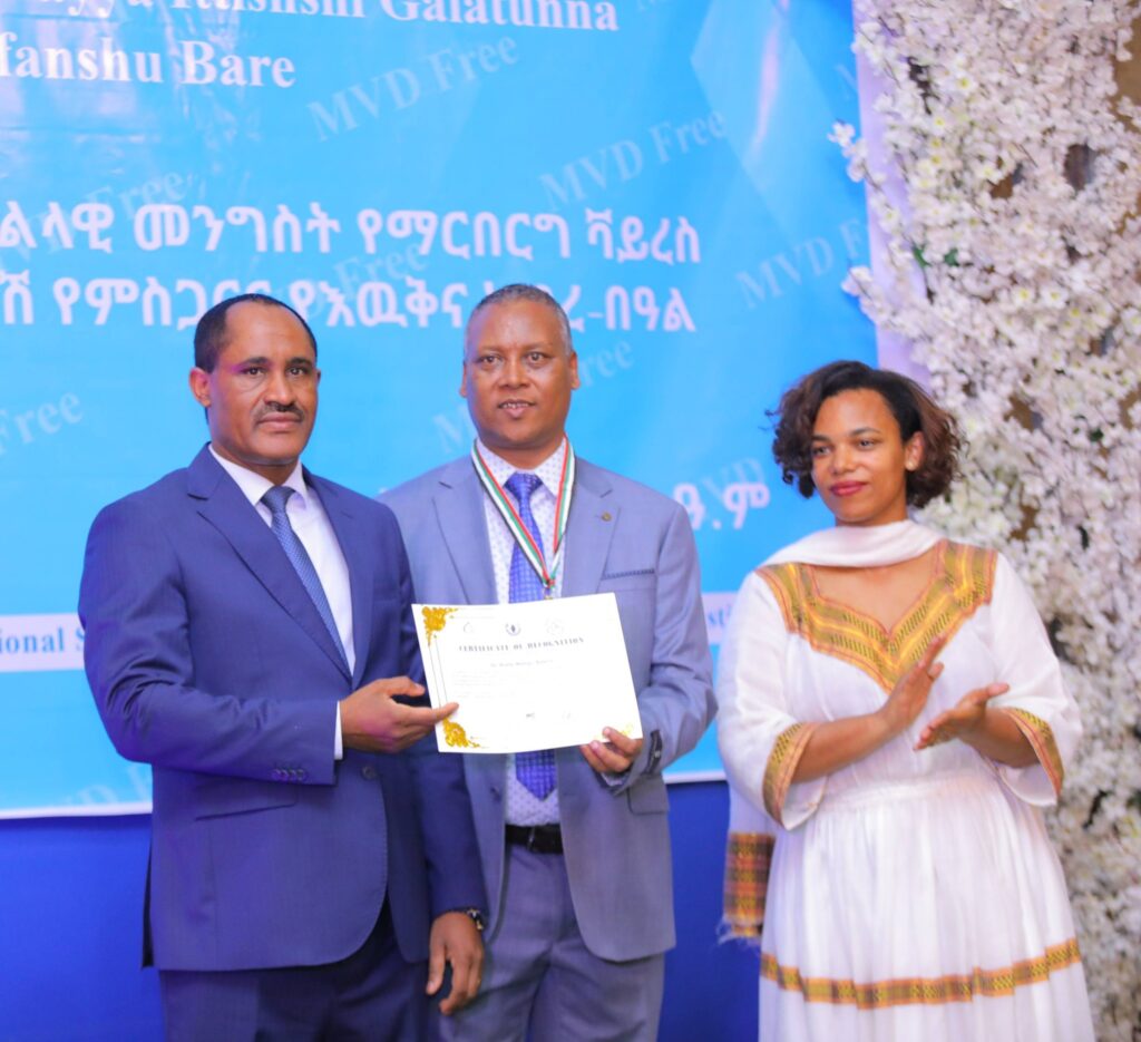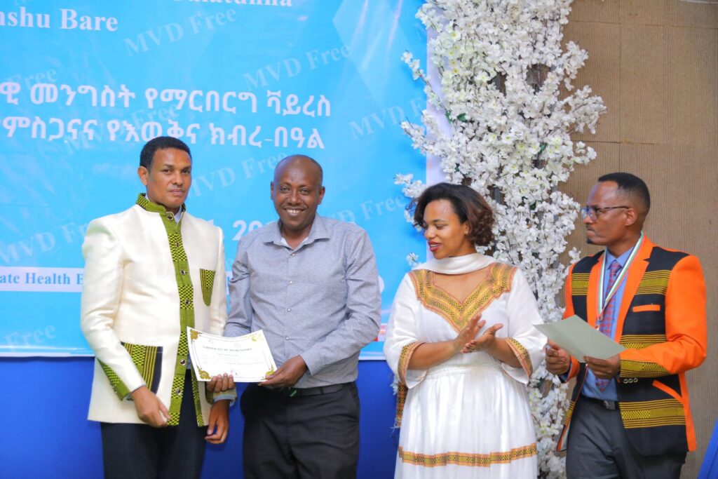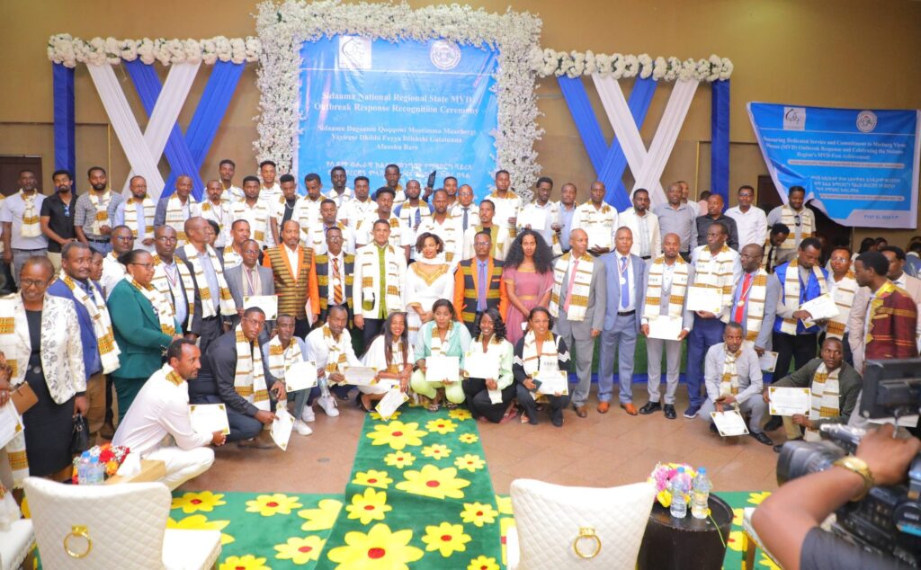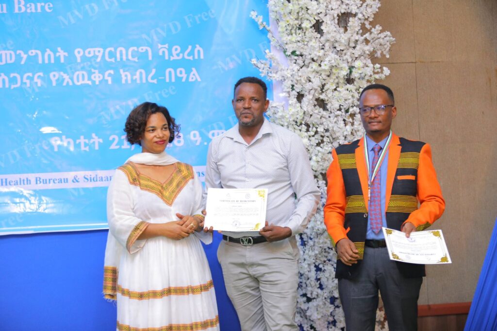በሲዳማ ክልል የማርበርበርግ ቫይረስ ስርጭትን በመከላከል ሂደት የላቀ ሚና ለተወጡ አካላት የክልሉ ርዕሰ መስተዳደር ክቡር አቶ ደስታ ሌዳሞ፣ የፌደራልና የክልሉ ቁልፍ አመራሮች እና የስራ ኃላፊዎች የጤና ባለሙያዎች እንዲሁም አጋር ድርጅቶች እና ባለድርሻ አካላት በተገኙበት የዕውቅናና የምስጋና መርሐ ግብር ተከናውኗል።