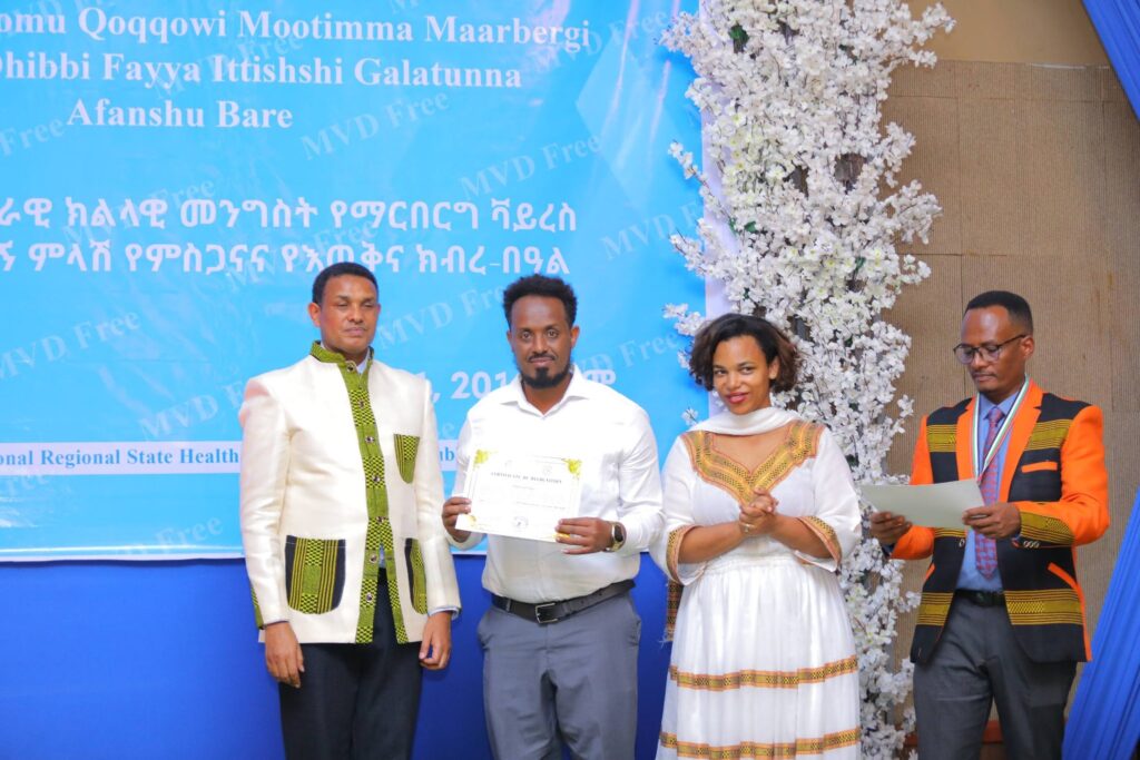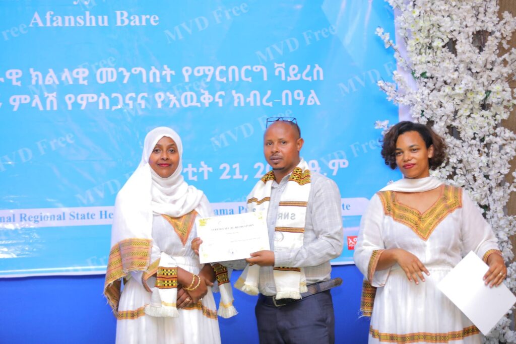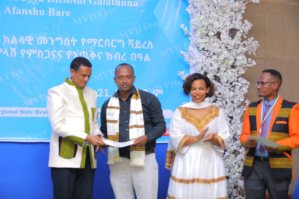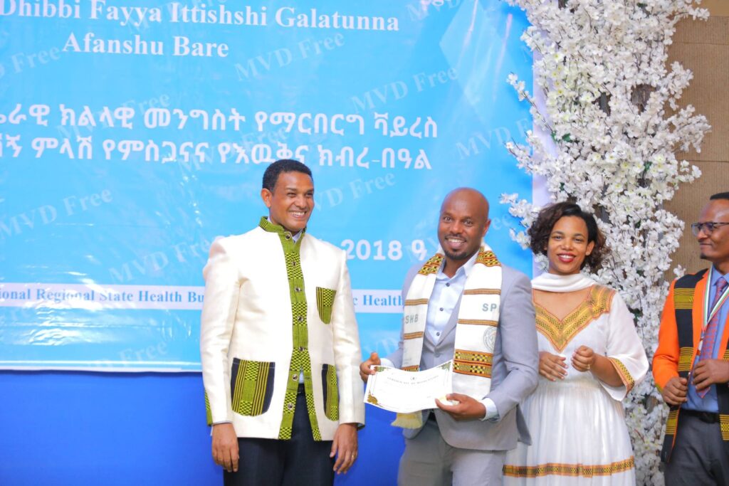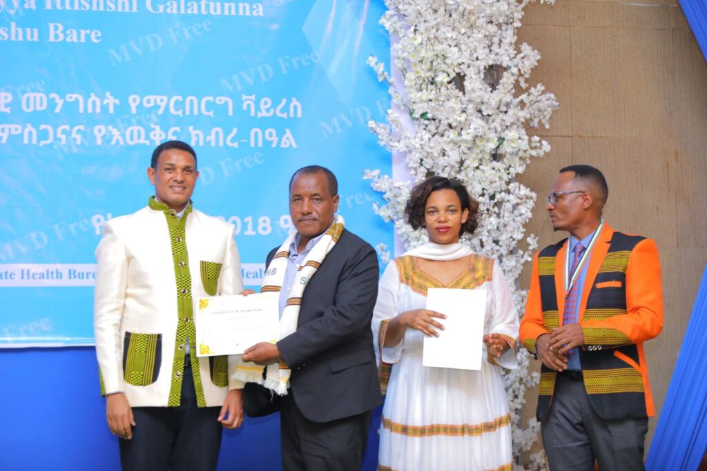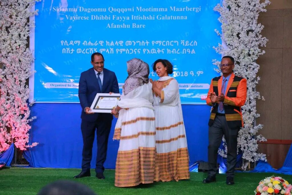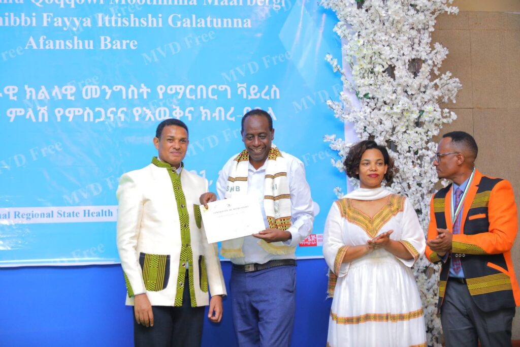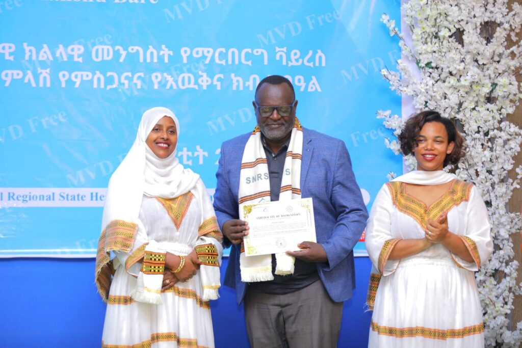 በሲዳማ ክልል የማርበርበርግ ቫይረስ ስርጭትን በመከላከል ሂደት የላቀ ሚና ለተወጡ አካላት የክልሉ ርዕሰ መስተዳደር ክቡር አቶ ደስታ ሌዳሞ፣ የፌደራልና የክልሉ ቁልፍ አመራሮች እና የስራ ኃላፊዎች የጤና ባለሙያዎች እንዲሁም አጋር ድርጅቶች እና ባለድርሻ አካላት በተገኙበት የዕውቅናና የምስጋና መርሐ ግብር ተከናውኗል።